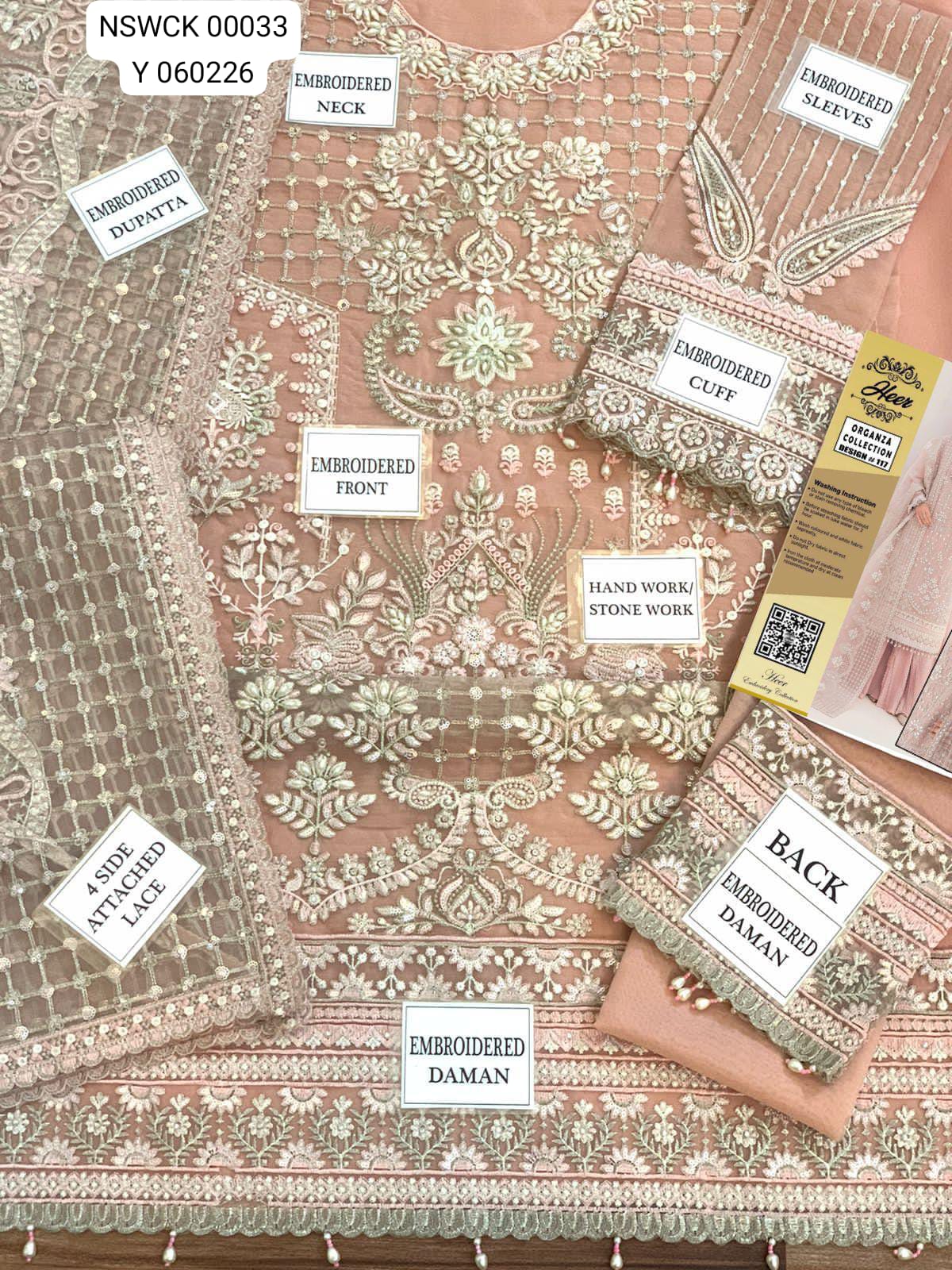 Fancy Peach Organza Silk Heavy Embroidered Unstitched 3 piece